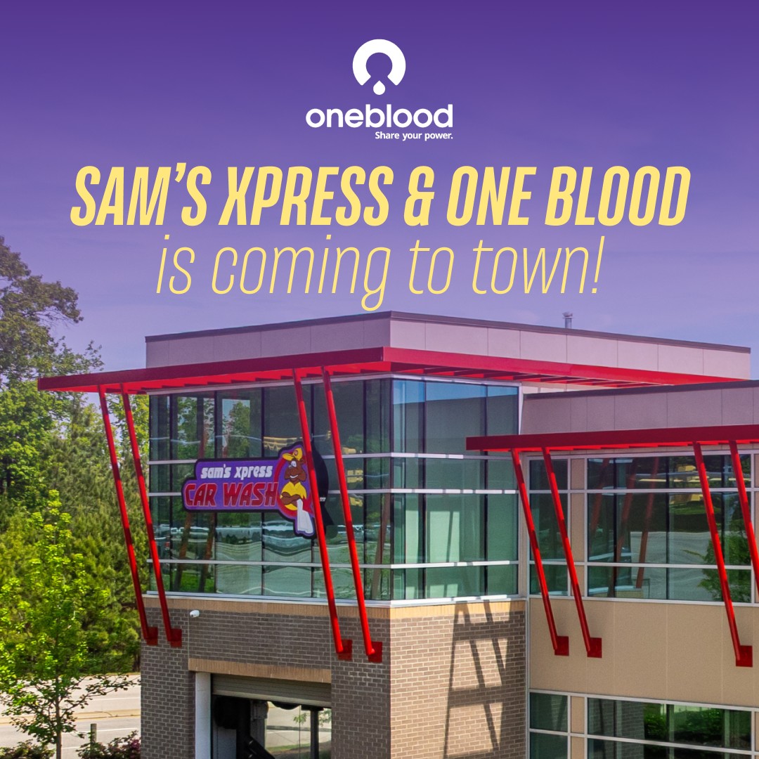 We’re hosting OneBlood at several Sam’s Xpress® Car Wash locations this month. Take a look for one near you:
